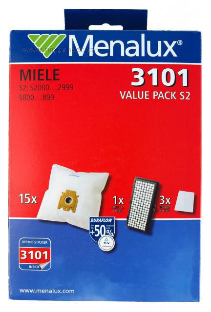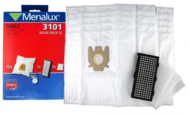 Menalux 3101VPS2 Sáčky a HEPA filtr pro vysavače Miele S2, S 2000 Zvýhodněná sada HEPA filtru, sáčků a filtrů pro vysavače MIELE S 2000 až S 2999, MIELE S 2... Sada obsahuje 15 sáčků z netkané textilie typ MIELE GN, 3 mikrofiltry k zastřižení a HEPA filtr certifikované filtrační třídy H12 - odpovídá značení MIELE SF-AH30. Výrobce Electrolux pod svou značkou Menalux.