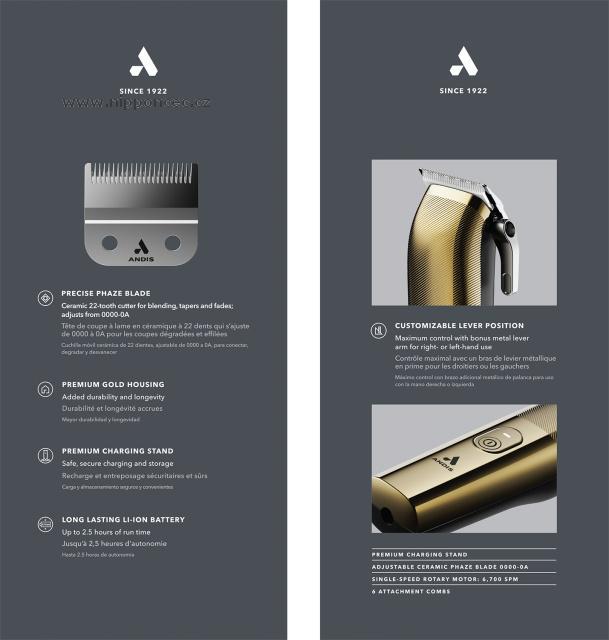 Designový střihací strojek ANDIS 561568 Envy II - Premier Edition přináší profesionální výkon a elegantní design pro všestranné použití. Tento lehký ergonomicky tvarovaný strojek je vhodný pro praváky i leváky díky vyměnitelné páčce. Lithium-iontový akumulátor zajišťuje až 2 hodiny provozu na jedno nabití, strojek je možné napájet i ze sítě. Určeno pro profesionální i domácí použití. Součástí balení je 6 přídavných hřebenů a příslušenství pro pravidelnou údržbu strojku.Střihací strojek ANDIS Envy II -  Premier Edition