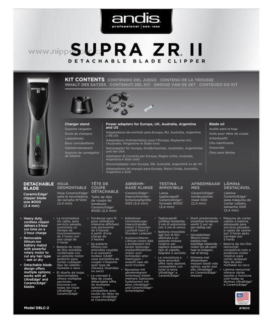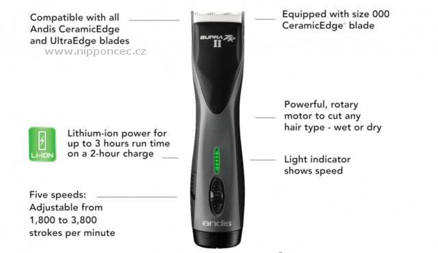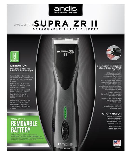 Profesionální akumulátorový stříhací strojek Supra ZR II od americké firmy ANDIS s keramickou hlavicí a silným rotačním motorem je ideální do náročných provozů. Zastřihovač je vhodný pro jakýkoliv typ vlasů, jak suchých tak mokrých. Nový vylepšený lithiový akumulátor vydrží až 3 hodiny provozu a dobije se během 120 minut. Pro zajištění plynulého provozu lze baterii stříhacího strojku vyjmout a využít náhradní baterie (náhradní akumulátor není součástí balení). Keramická hlavice je snadno odnímatelná pro rychlou výměnu nebo snadnou údržbu.