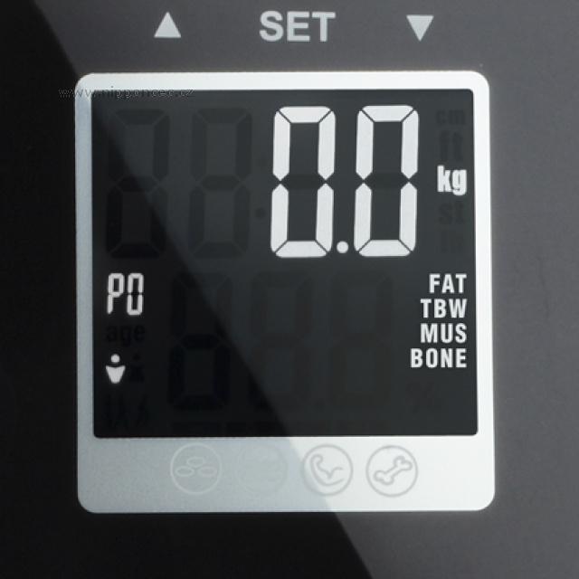 Analýza % tělesného tuku, svalů i vody, tvrzené sklo, design