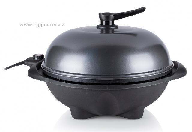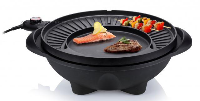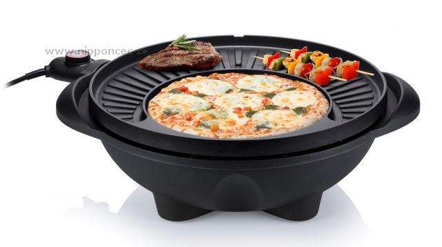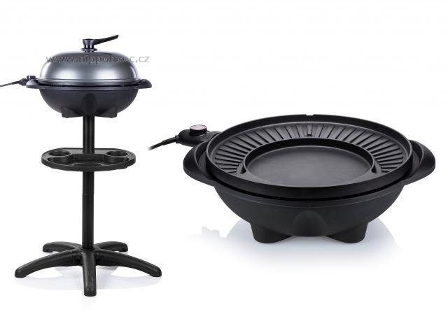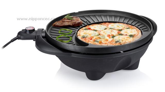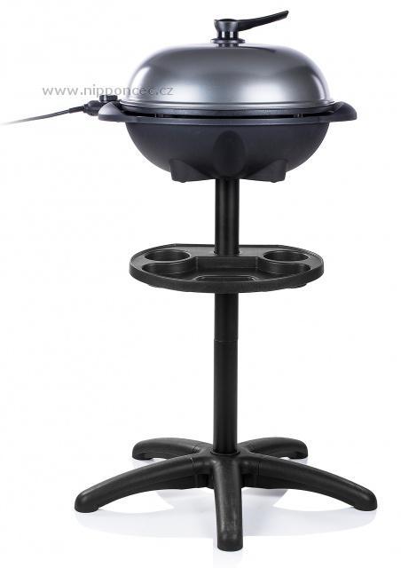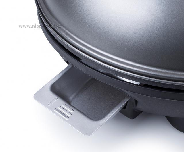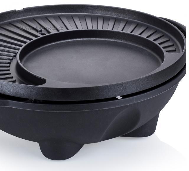 Grilovací plotna je netradiční - tvoří ji svažující se vroubkovaná část, která výborně odvádí tuk z masa a je vroubkovaná, a je vroubkovaná pro charakteristické opečení masa, menší kruhová plotýnka slouží spíše jako pánev - je zcela hladká, ideální na přípravu na přípravu bramboráků, palačinek, vajec, také třeba pizzy. Gril je robustní, vyrobený z kvalitních materiálů, jeho váha je 6,2 kg a je vybaven integrovaným systémem pro stékání přebytečného tuku (do spodní části přístroje) - grilované potraviny tukem nenasáknou - nejsou mastné, ale jsou křupavé. Gril je snímatelný z podstavce, v případě nepřízně počasí jej lze použít i jako stolní v altánu či v domácnosti. Na podstavci je umístěn držák na dochucovadla nebo kuchyňské náčiní. Praktické víko je nejen dekorativní, ale také velmi praktické po použití gril lze zavřít, do výrobku se nedostane prach a jiné nečistoty. Stolek je skládací, nezabere mnoho místa. Povrch termostatu je odolný proti stříkání tuku. Na podstavci je umístěn i držák na grilovací příslušenství nebo ingredience - barbecue omáčky, aj.