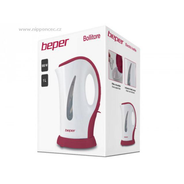 Rychlovarná konvice Beper má objem 1 litr a příkon 950W. Disponuje odnímatelným filtrem v hubici a ukazatelem hladiny vody. Tlačítko zapnutí / vypnutí je umístěno pod rukojetí. Konvice disponuje automatickým vypnutím a bezpečnostní pojistkou proti přehřátí.