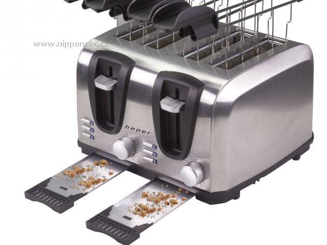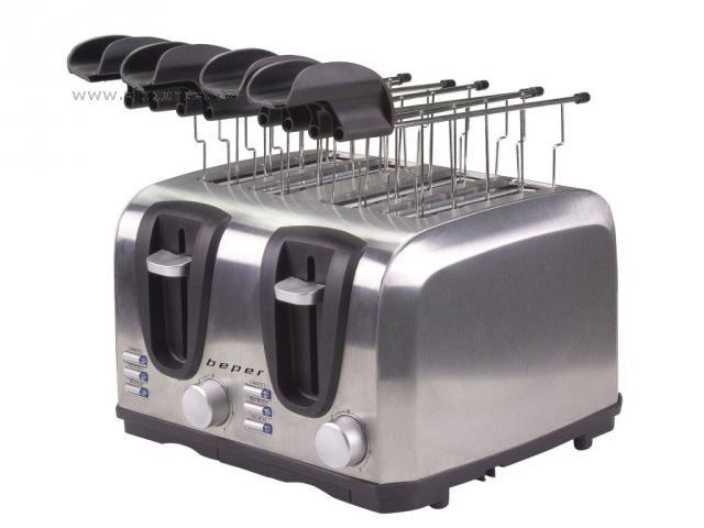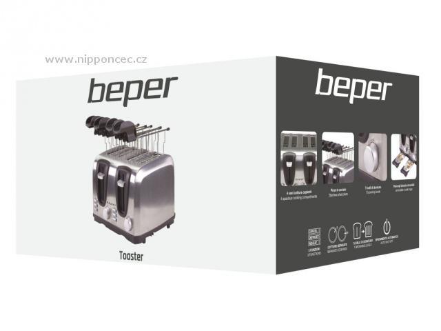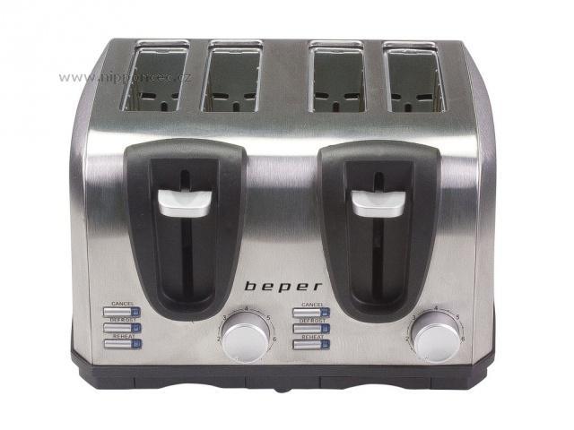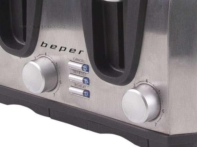 Elegantní topinkovač BEPER BT050 z nerezové oceli pro přípravu 4 křupavých toastů je vybaven funkcemi: "rozmrazit" pro rozmrazení zmrazeného pečiva, "ohřev" a "zrušit" pro zastavení procesu opékání. Regulace intenzity opečení v 7 stupních. Dva nezávisle nastavitelné ovladače umožňují různé nastavení propečení pro dvojici toustů ve stejném čase. Automatické vypnutí na konci opékání. Snadná údržba díky vyjímatelné zásuvce na drobky.