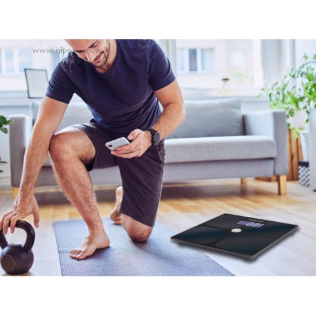 Měří 21 tělesných indikátorů, nosnost 180 kg, podsvícený LCD displej, Bluetooth.