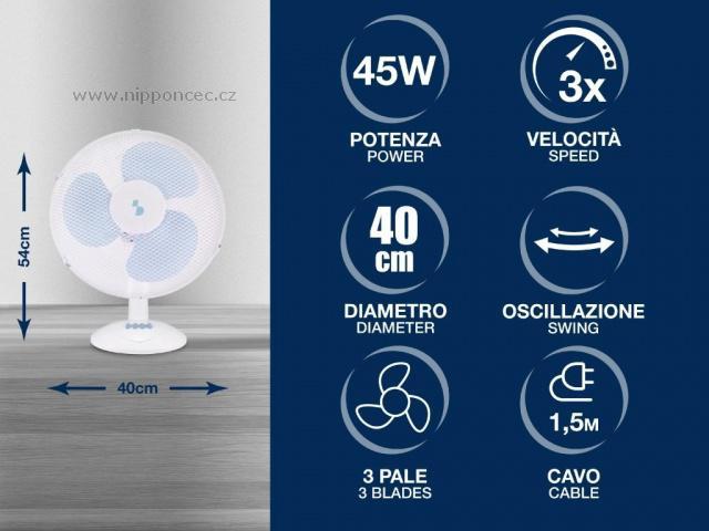 Stolní ventilátor, průměr 40 cm, automatická oscilace, 3 lamely.