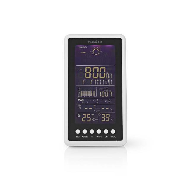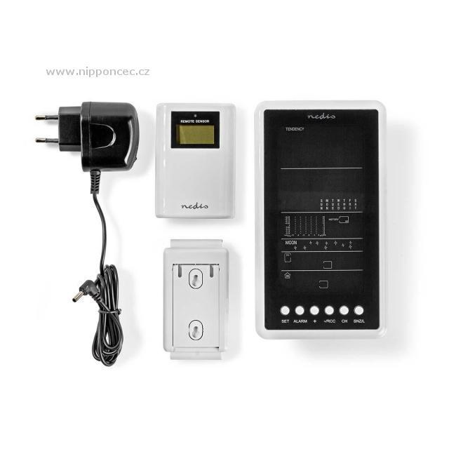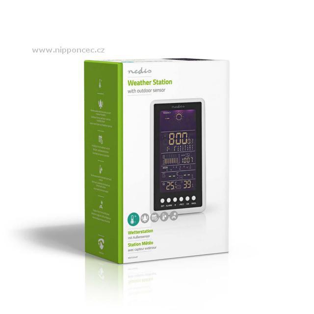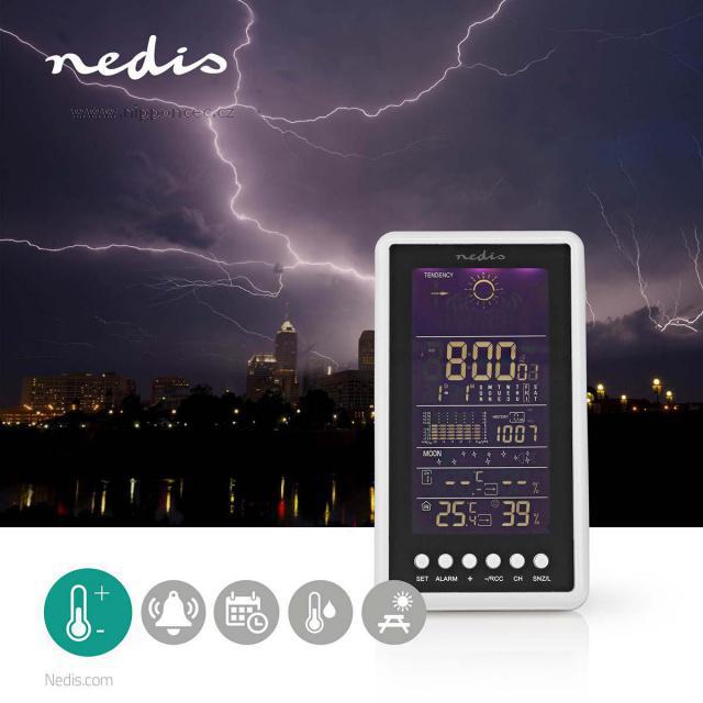 Bezdrátová meteorologická stanice Nedis WEST204WT poskytuje souhrnné informace nejen o aktuálním počasí venku, ale také i o teplotě a relativní vlhkosti vzduchu v místnosti. Na modře podsvíceným LCD displeji tohoto zařízení se také zobrazuje zjednodušená předpověď počasí dle 4 piktogramů: slunečno, polojasno, oblačno a deštivo; kalendář (nahraný až do roku 2099) a fáze měsíce. Tato meteostanice od společnosti Nedis má digitální hodiny (vždy uvádí přesný čas a datum díky rádiovému DCF signálu, užívanému pro dálkovou synchronizaci a seřizování hodin) a funkci budíku s tlačítkem SNOOZE (opakované buzení po 5 minutách). Součástí balení je bezdrátový venkovní snímač s držákem s montážními otvory (napájení 2x mikrotužkovými AAA bateriemi, které nejsou součástí balení) a 1,5 metru dlouhým kabelem na připojení meteostanice k síti.Meteorologická stanice Nedis WEST204WT s modrým podsvícením displeje, s hodinami, kalendářem, budíkem a barometrem