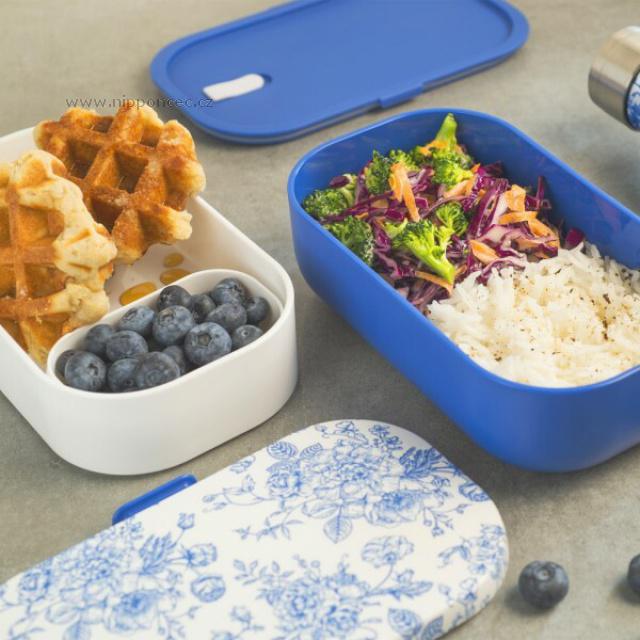 Bento box na jídlo Yoko Design Toile de Jouy s originálním designem je ideální pro přenášení všech druhů potravin od salátů, přes omáčky až po dezerty. Skládá se ze dvou hermeticky uzavíratelných nádob, malého zásobníku na omáčku o objemu 95 ml a pružného pásku, který všechny části boxu spojuje do jedné. Nádoby dobře těsní díky silikonovému těsnění. Po použití krabičky snadno umyjete v ruce, nebo v myčce nádobí. Ekologický, neobsahuje BPA. Vhodný do mikrovlnné trouby a mrazničky.Lze mýt v myčce nádobí.
