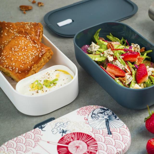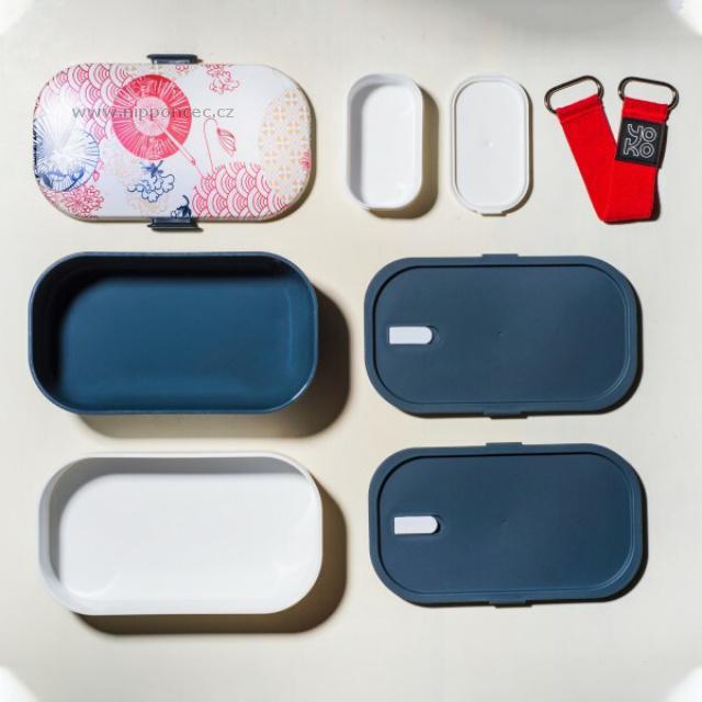 Bento box na jídlo Yoko Design Japan s originálním designem je ideální pro přenášení všech druhů potravin od salátů, přes omáčky až po dezerty. Skládá se ze dvou hermeticky uzavíratelných nádob, malého zásobníku na omáčku o objemu 95 ml a pružného pásku, který všechny části boxu spojuje do jedné. Nádoby dobře těsní díky silikonovému těsnění. Po použití krabičky snadno umyjete v ruce, nebo v myčce nádobí. Ekologický, neobsahuje BPA. Vhodný do mikrovlnné trouby a mrazničky. Lze mýt v myčce nádobí.