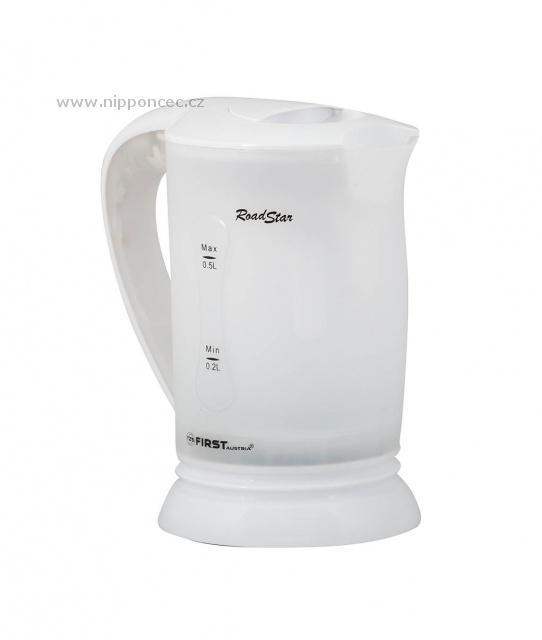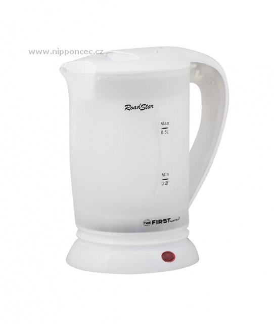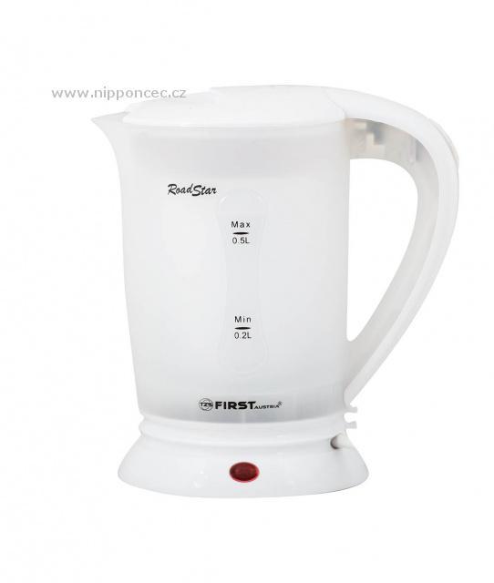 Cestovní rychlovarná konvice First FA 5425-2 W v bílé barvě. Konvice má obsah 0,5 litru, skrytou topnou spirálu a světelnou kontrolku provozu. Na spodní části konvice jsou protiskluzové zábrany. Součástí balení jsou dva plastové hrníčky v bílé barvě. Vypnutí je automatické, na transparetní části konvice je ukazatel hladiny vody.