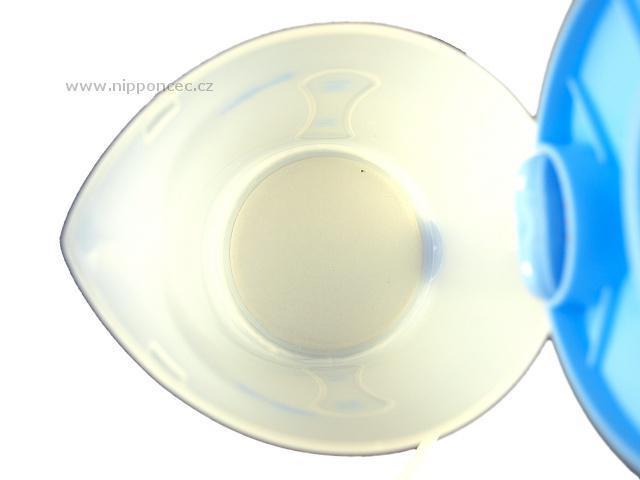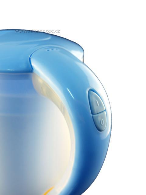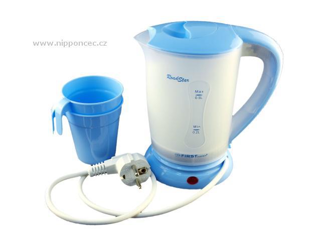 Cestovní rychlovarná konvice First FA 5425-2 W v modré barvě. Konvice má obsah 0,5 litru, skrytou topnou spirálu a světelnou kontrolku provozu. Na spodní části konvice jsou protiskluzové zábrany. Součástí balení jsou dva plastové hrníčky v bílé barvě. Vypnutí je automatické, na transparetní části konvice je ukazatel hladiny vody.