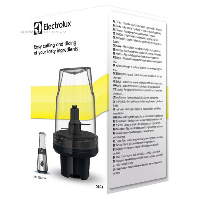 Přejete si rozšířit možnosti vašeho mixéru? Pak tento chopper SBC1 od firmy Electrolux je samostatný díl, který lze dokoupit k fitness mixérům s označením ESB2350, ESB2900, ESB2500, ESB2700, ESB2300. Je určený na sekání ingrediencí pro přípravu pokrmů, mletí koření, kávy a jiné.
