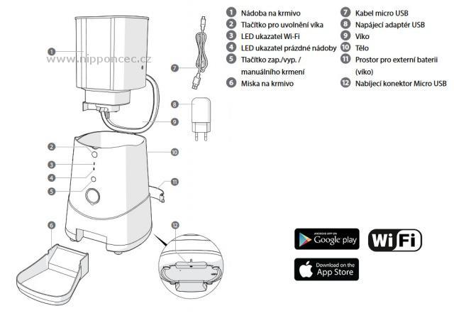 S tímto chytrým automatem na krmivo pro domácí mazlíčky můžete přesně naprogramovat, ve kterou dobu bude vydáno určité množství jídla (ve zhruba 10g porcích). Kromě toho můžete své mazlíčky krmit i na dálku prostřednictvím aplikace ve svém chytrém telefonu. Nyní máte dobu krmení svých mazlíčků a přesnou velikost porcí plně ve svých rukou. Vaše kočka či pes už nebudou muset na jídlo čekat, když přijdete domů pozdě, a už nemusíte žádat sousedy, aby Vám mazlíčky nakrmili, když odjedete na víkend. Automat na krmivo pro domácí mazlíčky má odnímatelnou nádobu na krmivo, která pojme až 3,7 l suchého krmiva. Snímač Vás bude prostřednictvím LED indikátoru informovat a odešle Vám oznámení na telefon, když bude nádoba již téměř prázdná, abyste ji mohli vyčistit a znovu naplnit. Druhý snímač bude při každém krmení kontrolovat, že jídlo bylo opravdu z automatu podáno. Bude-li nádoba zcela prázdná, ucpe-li se nebo se převrhne, obdržíte oznámení, že jídlo z automatu nebylo podáno. Krmítko domácích mazlíčků je napájeno 5V 1A USB nabíječkou a kabelem s konektorem USB a micro-USB. Abyste zajistili, že Vaši mazlíčci dostanou najíst i během případného výpadku proudu, můžete k zařízení připojit jako záložní řešení powerbanku (není součástí balení). Plán krmení je uložen v produktu, takže i bez připojení k síti Wi-Fi dostanou Vaši mazlíčci jídlo v nastavenou dobu.