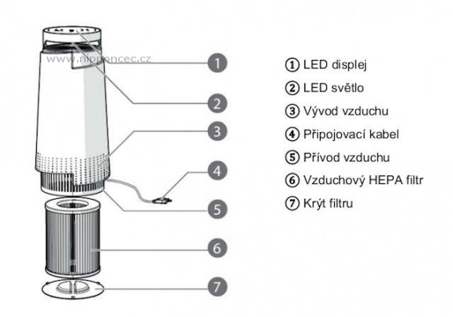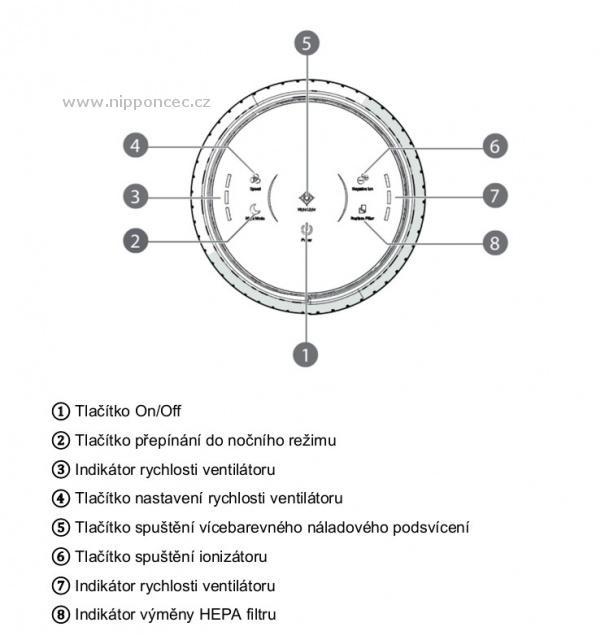 Integrovaný ionizátor, dotykový LED displej, ventilátor s třemi rychlostmi