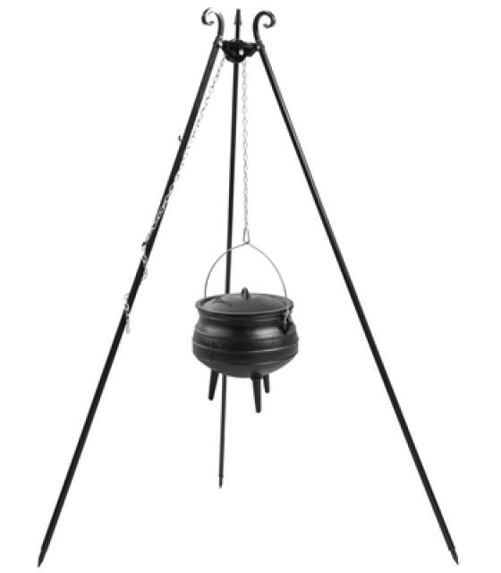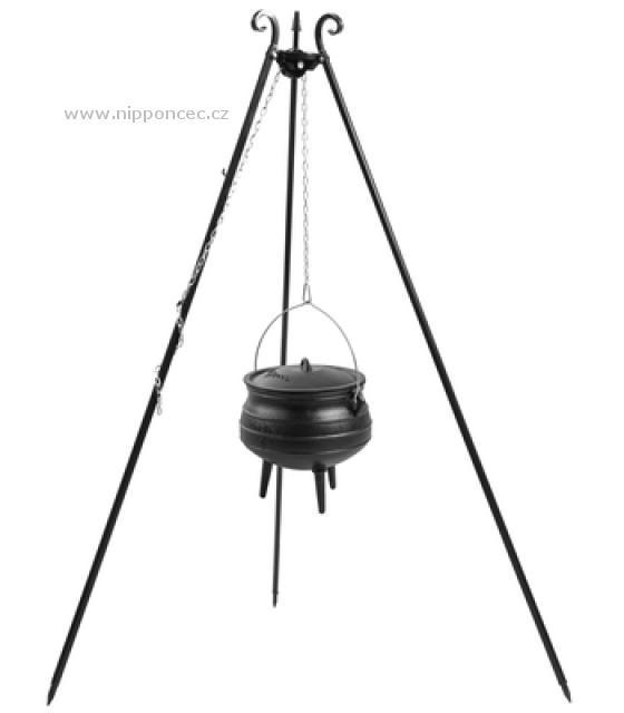 Stabilní trojnožka ke kotlíku nebo roštu pro vaření či grilování na otevřeném ohni, umožňuje grilovat na jakémkoli povrchu, dokonce i nerovném. Trojnožka je opatřena práškovou barvou pro větší odolnost proti mechanickému poškození a povětrnostním vlivům. Výšku kotlíku lze snadno upravit pomocí řetízku, kladky umístěné v horní části trojnožky, a háčků. Součástí je litinový kotlík 13 l.