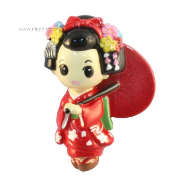 Ozdobná magnetka - např. na chladničku - s motivem japonské panenky Kokeshi s červeným deštníkem a červeným kimonem. „Maiko" je japonský výraz pro ženu, která se chce stát gejšou.