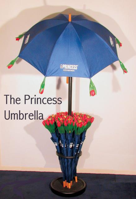 Deštník v  modré barvě, lze použít jako dekoraci do obchodu nebo pro běžné použití. Masivní provedení, modrá barva s logem Princess. Na žebrech jsou tulipány v červené barvě - lze sejmout dolů a použít jako běžný deštník.