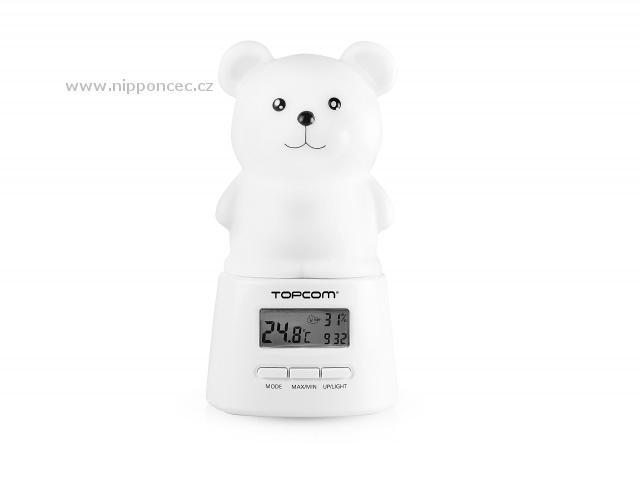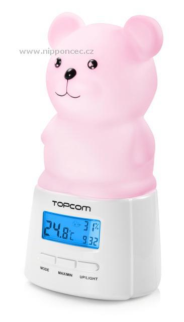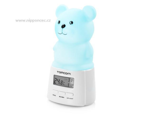 Dětské LED noční osvětlení Topcom KL-4330 pro nemluvňata či malé děti do dětského pokojíčku. Medvídka ovládáte dotykovým sensorem - stlačením nosíku. Zvolit můžete buď růžovou nebo modrou barvu nebo bílou barvu pro pohodlí neklidného dítěte. Změnu barev lze nastavit i automatickou. Provoz je možný buď na klasické alkalické baterie 2x mikrotužková AAA nebo dobíjením přes USB adaptér. Na displeji se zobrazuje teplota v místnosti a vlhkost - pro komfort vašeho děťátka.