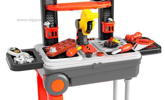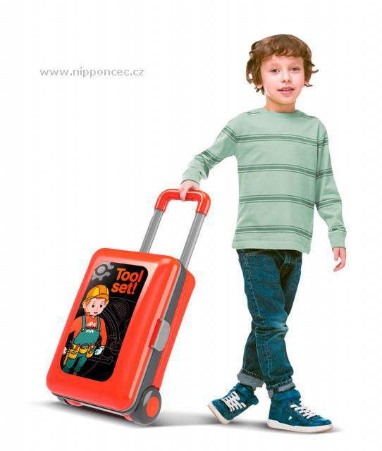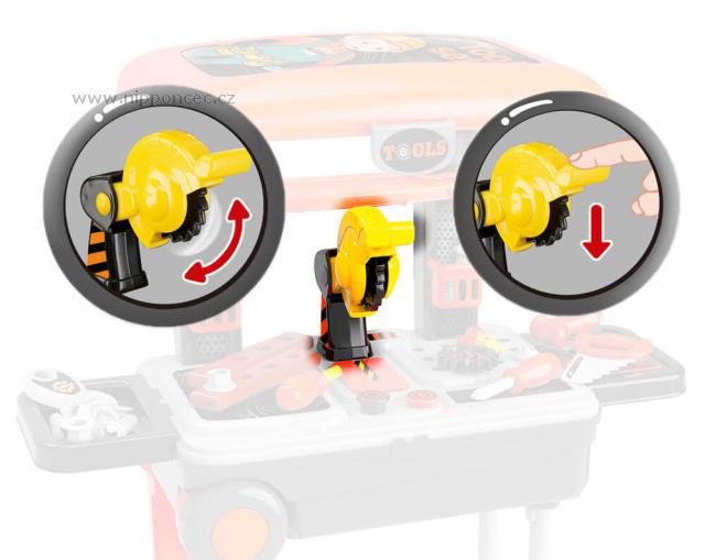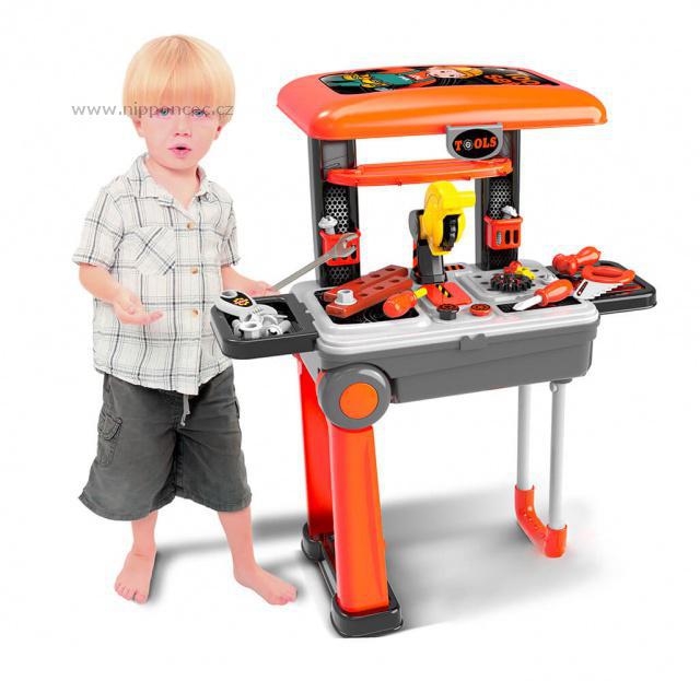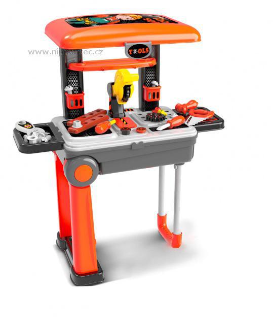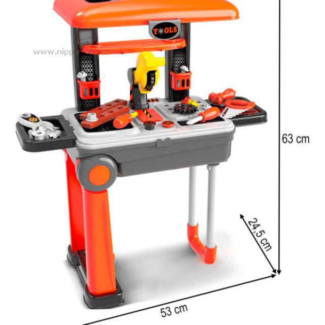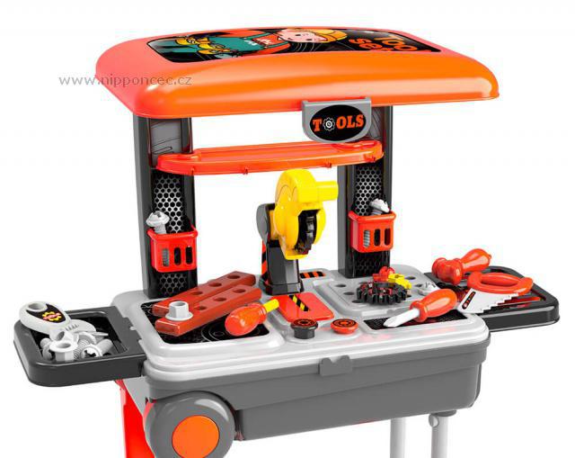Dětská dílna s nářadím je skvělá zábava pro malé kutily. Kluci a holky díky hře zlepšují své jemné motorické dovednosti, např. pohyb šroubovákem uvolňuje zápěstí (vhodné při výuce psaní). Dětská dílna je v praktickém provedení složitelná do kufru na kolečkách a tak v pokojíčku vašeho dítěte nezabere příliš místa. Součástí dílny je dětské nářadí (plochý šroubovák, křížový šroubovák, kladivo, ruční pila, mechanická pila s imitací rotující čepele, nastavitelný klíč) a spojovací materiál ( 6 x šrouby, 6 x matky, 3 x pásek s otvory, 3 x ozubená kola.