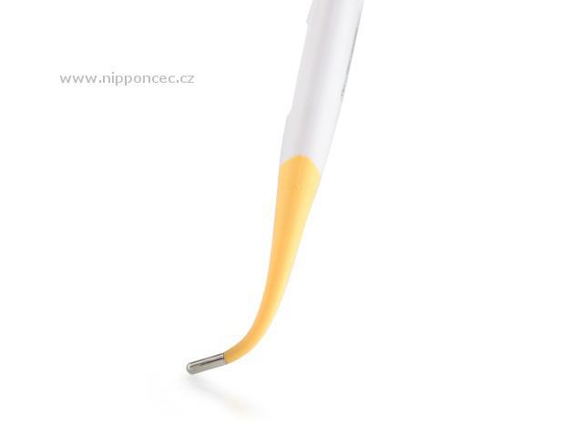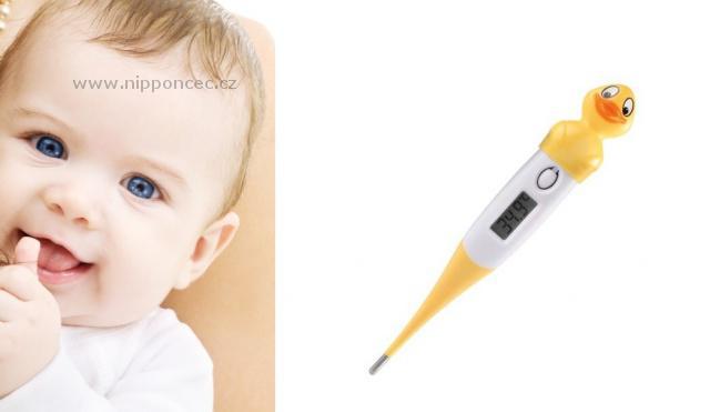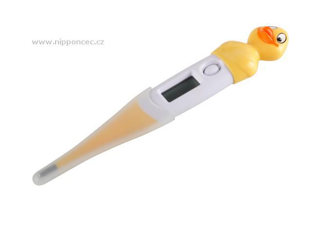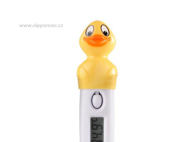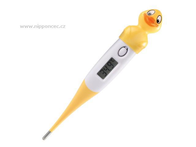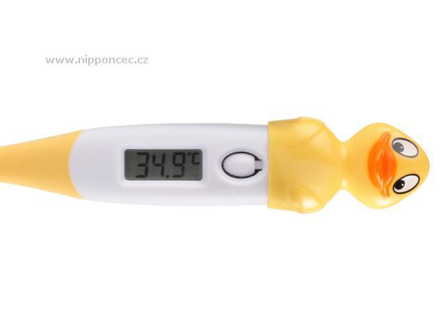 Jednoduchý dětský digitální teploměr ve veselém designu kačenky je vhodný pro klasické měření teploty v podpaží, zvládne však i orální a rektální měření. Teplotu změří za pouhých 10 vteřin a disponuje i pamětí pro poslední měření, díky čemuž budete moci pohodlně sledovat vývoj tělesné teploty vašeho dítěte. Neobsahuje rtuť ani sklo, tudíž je ideálním a bezpečným pomocníkem pro měření teploty dětí.