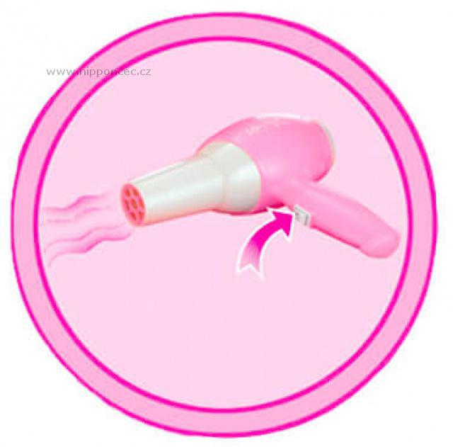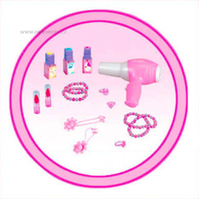 příslušenství - gumičky do vlasů, dětské šminky, barevné náramky, korále a fén na baterie, který jemně fouká vzduch. V čele stolku je zásuvka na uložení drobností.