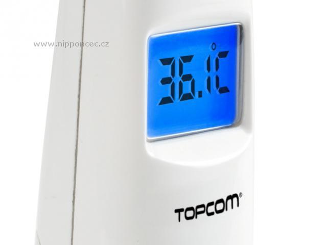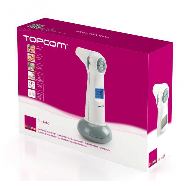 Multifunkční infračervený teploměr Topcom : změříte s ním pohodlně teplotu čela, v uchu, pokojovou teplotu, má zabudované měření data a času. Teploměr Topcom má omyvatelnou antibakteriální sondu, tedy jeho údržba je snadná. Je neprosto bezpečný, bez rtuti. K dispozici je 9 pamětí.