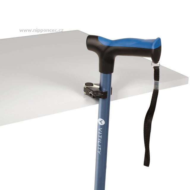 Držák vycházkové hole Vitility 70510150 výrazně zjednoduší odkládání hole, když potřebujete mít volné ruce. Držák hole je z jedné strany vybaven svorkou pro umístění hole a z druhé strany pěnovým polštářkem, který zajistí uchycení hole na okraji stolu či pultu.