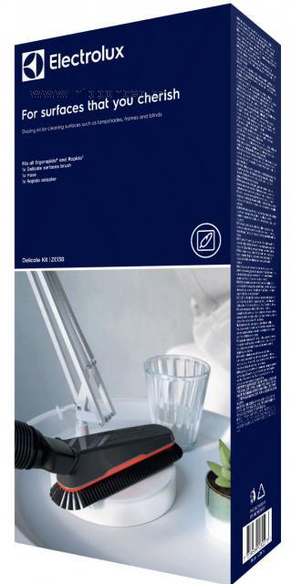 Sada hubic na jemné povrchy k vysavačům Rapido a ErgoRapido Electrolux a AEG. Electrolux Delicate Kit obsahuje vše pro šetrnou péči - jemný kartáč pro odstraňování prachu a vzdušné částice s měkkými štětinami, ideální pro oprašování rolet a žaluzií, stínidel lamp, skleněných povrchů, ve voze palubní desky, průduchů ventilátoru, flexibilní štěrbinovovu hubici pro účinné čištění ve stísněných prostorech a těžko přístupných místech - mezi sedačkami, ve mezerách mezi jednotlivými částmi čalouněného nábytku, v rozích, škvírách a redukci pro připojení k vysavači.