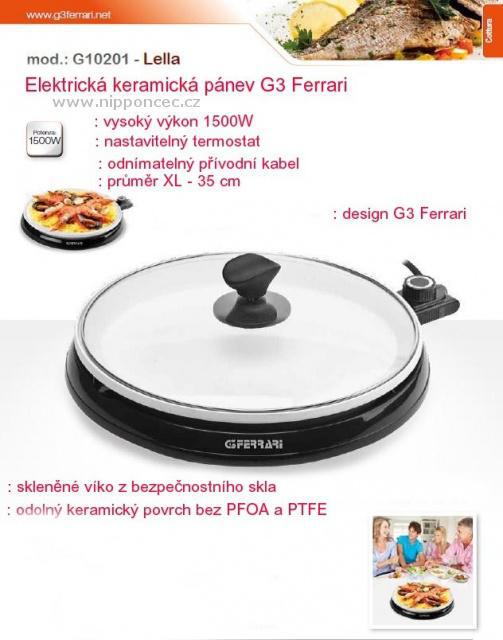 Elektrická keramická pánev od tradičního italského výrobce G3 Ferrari, je opatřena kvalitním nepřipékavým keramickým povrchem. Průměr pánev je 35 cm , keramická vrstva je silná, neodlupuje se ani neprýská. Keramická pánev G3 Ferrari je ideální pro dušení, pečení, vaření i smažení mnoha masa, zeleniny, ryb, luštěnin, brambor a dalších potravin a to téměř bez nutnosti použití tuku a výraznou finanční úsporou - rychle se nahřívá, pomalu chladne.