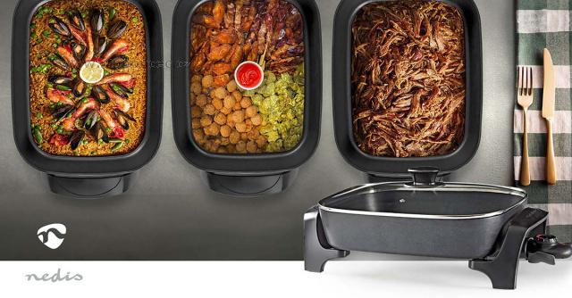 Elektrická pánev Nedis FCSP110EBK40 je skvělou volbou pro všechny, kteří hledají multifunkční zařízení pro vaření. Nepřilnavý povrch zajišťuje, že jídlo se k pánvi nepřichytává, což usnadňuje vaření, čištění a je možné připravovat jídlo s minimálním nebo žádným množstvím oleje, což přispívá ke zdravějšímu stravování. Lité topné těleso zajišťuje rovnoměrné rozložení tepla, což přispívá k dokonalému výsledku vaření. Možnost nastavení teploty vám umožňuje přizpůsobit vaření různým typům jídel. Poklička je vyrobena z tvrzeného skla spolu s knoflíky a držadly odolnými proti teplu. Po použití můžete pánev snadno umýt v myčce na nádobí (bez zástrčky ovládání teploty), což ušetří čas a námahu.