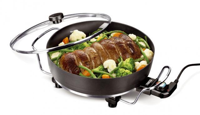 Elektrická pánev PRINCESS 16 2367 Wonder Chef Pro 6 litrů vyrobená z robustního kovu potaženého Teflon by Dupont Classic Original vrstvou, s obsahem 6 litrů a vysokými okraji. Elektrická pečicí pánev s obsahem 6 litrů má odnímatelný přívodní kabel s přesným nastavitelným termostatem pro jednoduchou údržbu a skleněné víko z masivního skla s parním ventilem pro komfortní obsluhu. Pečicí pánev má průměr 36 cm. Odnímatelný přívodní kabel je velmi praktický, pánev jednoduše po přípravě pokrmu odpojíte od přívodní šňůry, donesete na stůl a můžete servírovat.