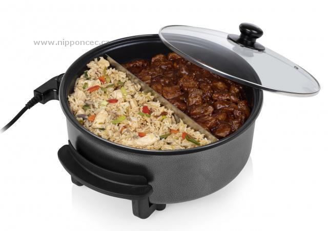 Elektrická pánev Tristar PZ 9135 vyrobená z robustního kovu potaženého kvalitní nepřipékavou úpravou na bázi teflonu. Objem pánve 5 litrů je dostatečný na přípravu jídla pro celou rodinu. Elektrická pánev má odnímatelný přívodní kabel s nastavitelným termostatem. Součástí pánve je přepážka, kterou je možné rozdělit pánev na dvě části a připravovat tak zároveň dva pokrmy současně. Pánev lze využít k udržení teploty již hotových pokrmů.