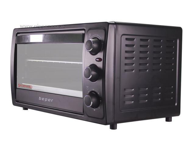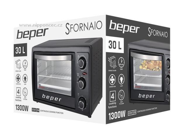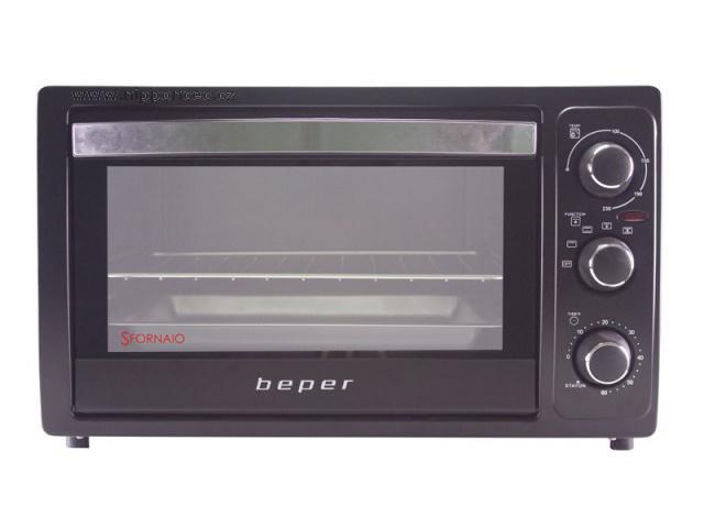 Kompaktní elektrická trouba BEPER 90884 s objemem 30 litrů. Elektrická trouba má dvířka s dvojitým sklem a tepelně izolovanou rukojetí. Tři ovládací přepínače umožní nastavit časovač až na 60 minut a teplotu až 230 °C. Samozřejmostí této trouby je možnost vybrat si požadovaný typ pečení. Součástí příslušenství je grilovací rošt a plech na pečení. Pro snadné vyjmutí horkého plechu z trouby je k dispozici madlo. Výkon trouby je 1300 W.