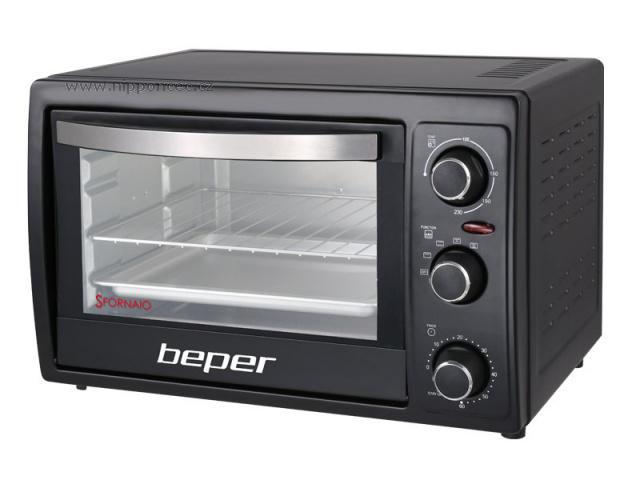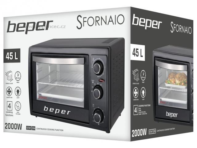 Volně stojící kompaktní elektrická trouba Beper 90886 s objemem 45 litrů má dvířka s dvojitým sklem a rukojetí, jejíž tvar je příjemný do ruky. Ovládací přepínače umožní nastavit časovač až na 60 minut a teplotu do 230 °C. Samozřejmostí této trouby je možnost vybrat si požadovaný typ pečení nebo grilování, trouba nabízí čtyři programy. Součástí příslušenství je grilovací rošt, plech na pečení a rukojeť na vyndávání horkého plechu. Disponuje vestavěným časovačem a zvonkem, který za vás ohlídá čas potřebný k upečení pokrmu. Výkon trouby je 2000 W.