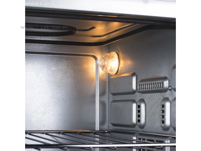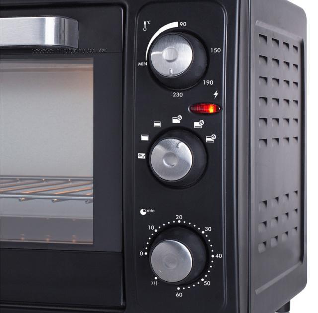 Výkon trouby je 2000W, termostat je nastavitelný 100 - 230°C . Dvířka mají masivní madlo, sklo dvířek je zdvojené. Součástí dodávky grilovací rošt s odnímatelnou rukojetí, plech na pečení . Na předním panelu je umístěna světelná kontrolka provozu, na spodní části jsou protiskluzové nožky pro bezpečné postavení na kuchyňské desce. Trouba má vynikající vybavení - 6 stupňů nastavení teploty, vnitřní osvětlení, funkce rozmrazování, funkce horkého vzduchu, funkce otočného grilu, nastavitelný časovač. Vynikající poměr cena ku výkon!