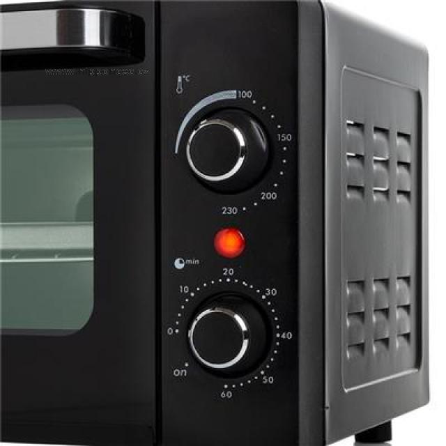 Dvířka mají zdvojené sklo a jsou opatřeny madlem. Součástí dodávky grilovací rošt s odnímatelnou rukojetí a plech na pečení. Na předním panelu je umístěna světelná kontrolka provozu, na spodní části jsou protiskluzové nožky pro bezpečné postavení na kuchyňské desce.
