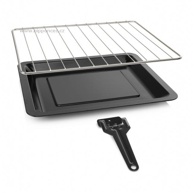 Termostat je nastavitelný od 90 °C - do 230°C. Dvířka mají masivní madlo a sklo dvířek je zdvojené. Součástí dodávky je grilovací rošt s odnímatelnou rukojetí a plech na pečení. Na předním panelu je umístěna světelná kontrolka provozu, na spodní části jsou protiskluzové nožky pro bezpečné postavení na kuchyňské desce. Trouba má vynikající vybavení - 6 programů ohřevu, vnitřní osvětlení, funkce horkého vzduchu, nastavitelný časovač. Vynikající poměr cena ku výkon!