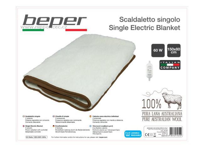 Elektrická deka z pravé ovčí vlny BEPER RI-403 se používá jako podložka/podkrývka pod prostěradlo. Vhodná pro předehřátí lůžka během chladnějších měsíců v méně vytápěných prostorech. Je vybavena odnímatelným ovladačem s 2 stupni pro nastavení výkonu. Deku lze prát v automatické pračce na 30 °C v programu jemné praní.