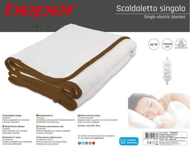 Elektrická vyhřívací deka BEPER RI-401 se používá jako podložka pod prostěradlo. Vhodná pro předehřátí lůžka během chladnějších měsíců v méně vytápěných prostorech. Je vybavena odnímatelným ovladačem s 2 stupni pro nastavení výkonu. Deku lze prát v automatické pračce na 30 °C v programu jemné praní.