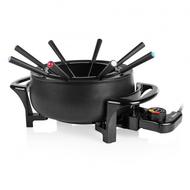 Rodinný fondue set FO-1107 od značky Tristar je vynikající pro přípravu klasického masového fondue, sýrového fondue, čokoládového fondue, čínského fondue nebo burgundského fondue. Disponuje regulovatelným odnímatelným termostatem opatřeným obrázky (čokoláda, sýr, vývar, olej) pro optimální nastavení teploty. Součástí balení je 8 nerezových vidliček a prstenec na jejich opření v nádobě. Sada obsahuje veškeré potřebné vybavení pro společné posezení s rodinou či přáteli.
