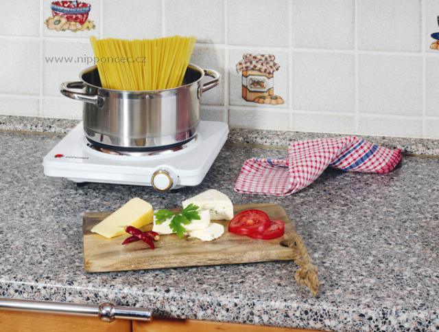 Malý, skladný, litinová plotýnka 185 mm, příkon 1500 W, světelná kontrolka.