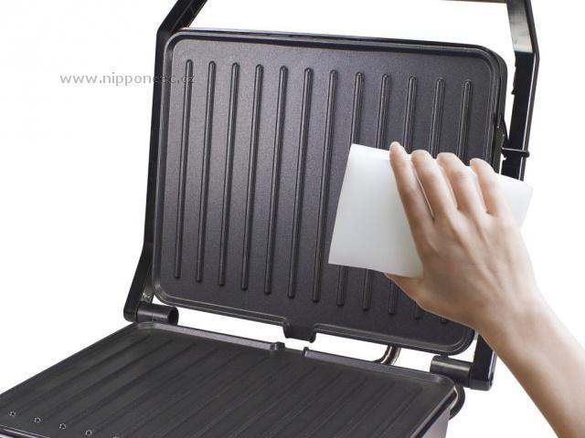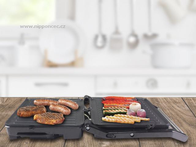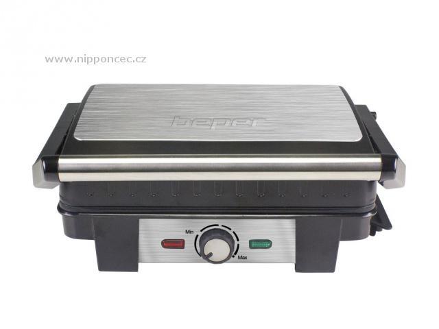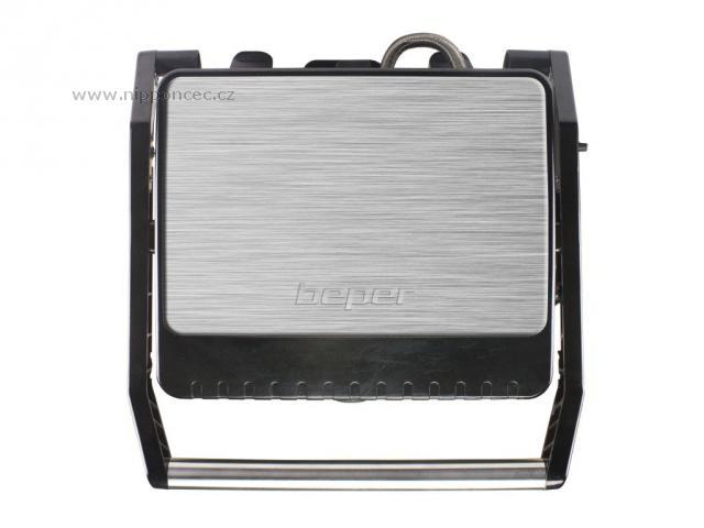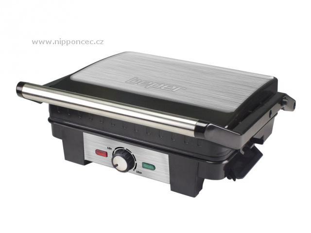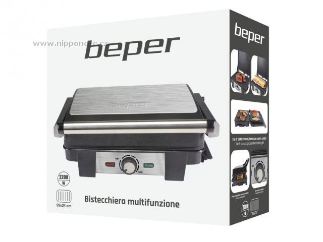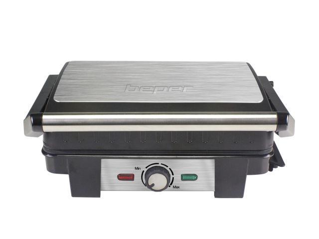 Multifunkční elektrický gril Beper s ocelovou a bakelitovou strukturou a grilovacími deskami o velikosti 29 x 24 cm z litého hliníku s nepřilnavým povrchem. Gril disponuje plynule nastavitelným termostatem a je plně rozevíratelný, čímž se vytvoří velká pečící plocha. Nechybí indikátor provozu, který upozorní na zapojení přístroje do elektrické sítě, indikátor nahřátí, který vám dá vědět v případě, že je gril nahřátý na požadovanou teplotu a praktická nádobka na přebytečný tuk.