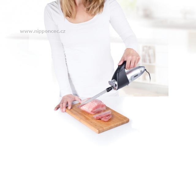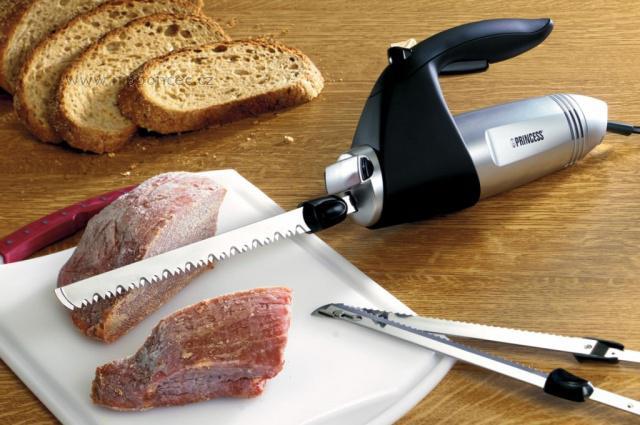 Elektrický nůž Princess s výkonem 180 W. Nůž je vyroben z robustního plastu ve stříbrnočerné povrchové úpravě. Součástí balení elektrického nože je praktický držák na zeď, multifunkční nůž i nůž na zmražené potraviny. Elektrický nůž Princess je vybaven ojedinělým systémem dvojí pojistky pro bezpečnou obsluhu a otočné rukojeti pro komfortní použití. Tato otočná rukojeť umožňuje vertikální, horizontální i diagonální řez. Výrobek byl oceněněn jako nejlepší z testovaných 5-ti nožů (1.Princess, 2. Russell Hobbs, 3.Tefal, 4.Tristar, 5.Inventum) v holandské TV revue pro spotřebitele KASA, určitě nezklame ani vás.
