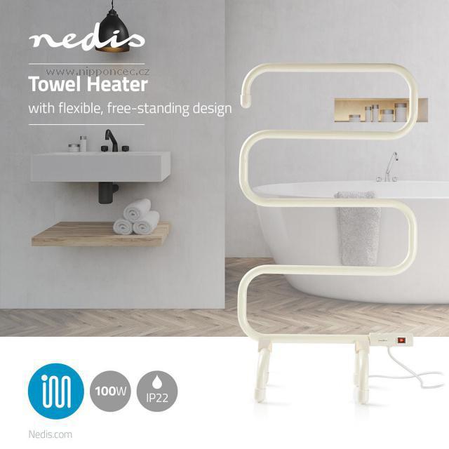 Přenosný ohřívač ručníků Nedis HTTO10EWT s výkonem 100 W představuje doplňkový zdroj tepla určený pro ohřívaní koupelnových ručníků před použitím a také pro urychlení jejich vysušení. Je vhodný pro nevytápěné nebo vlhké prostory, jako jsou koupelny, chaty, karavany nebo mobilheimy. Ohřívač je vybaven hlavním vypínačem (On/Off) s krytím IP 22. Tento ohřívač ručníků se také dá použit na ohřátí kabátů a bund před oblékáním. Výrobce upozorňuje, že tento ohřívač se zapojuje POUZE do uzemněných elektrických síťových zásuvek.