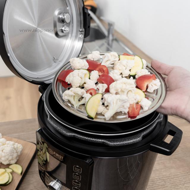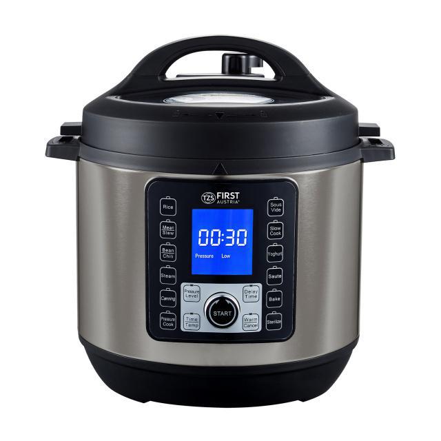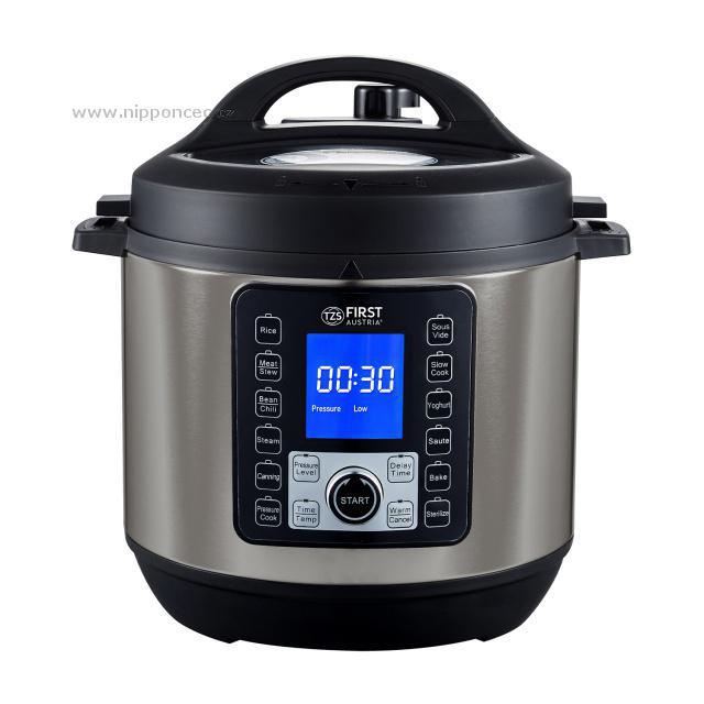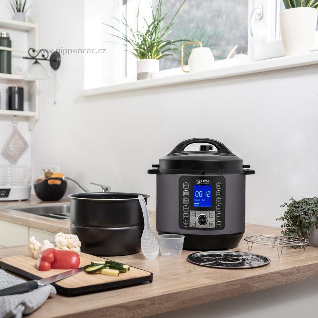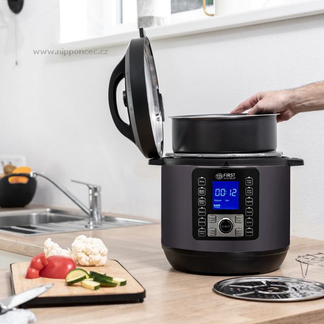 S tímto elektrickým hrncem zvládnete rychlé, energeticky úsporné a zdravé vaření zeleniny, masa, ryb, brambor a dalších potravin na mnoho způsobů bez ztráty vitamínů a minerálů. Elektrický tlakový hrnec First Austria FA 5130-2 2v1 v novém provedení z oceli v antracitově šedé barvě přichází s komfortní výbavou : 12 automatických programů Rýže, Maso / Dušení, Fazole / Chilli, Vaření v páře, Konzervování, Tlakové vaření, Sous-Vide, Pomalé vaření, Příprava Jogurtu, Sauté (restování), Pečení, Sterilizování, integrovaná funkce časovače, extra funkce udržení tepla, a digitální programování, obsah 6L. Je vhodný pro rychlé, energeticky úsporné a zdravé vaření zeleniny, masa, ryb, brambor a dalších potravin - do měkka, bez ztráty vitamínů a minerálů díky krátkému času přípravy. Úspora oproti klasickému vaření je cca 60-70% elektrické energie. Součástí dodávky je kuchařka - 8 základních receptů.