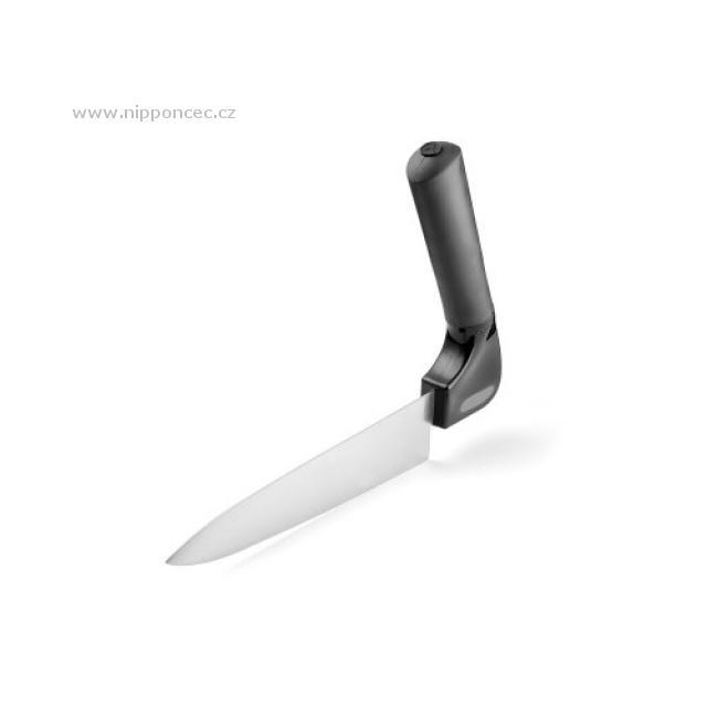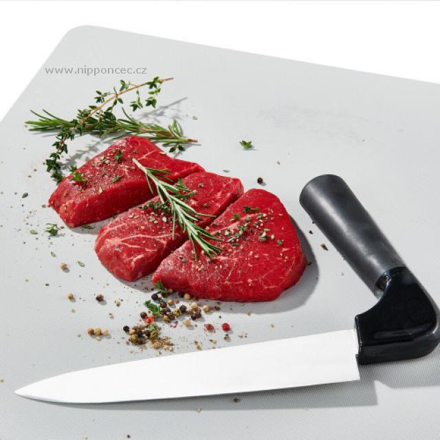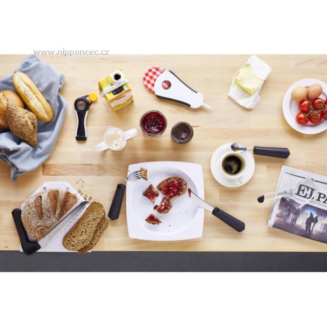 Zahnutá rukojeť pro menší úsilí při krájení, vhodné pro seniory.