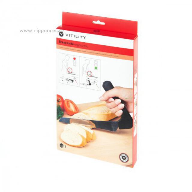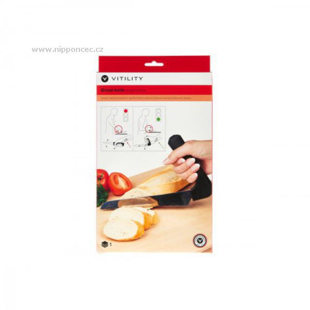 Kuchyňský nůž na pečivo Vitility 70210130 vám umožní snadno nakrájet chleba nebo bagetu. Pro pohodlné krájení je rukojeť nože zahnutá a tím drží ruku, zápěstí i paži v přirozené poloze, která zabraňuje nadměrnému namáhání zápěstí a s tím související bolestí nebo zánětu. Čepel nože je vyrobena z nerezové oceli a ergonomická rukojeť je vybavena protiskluzovou vrstvou.