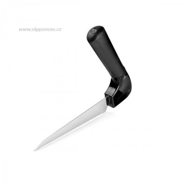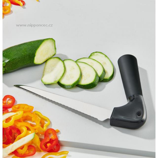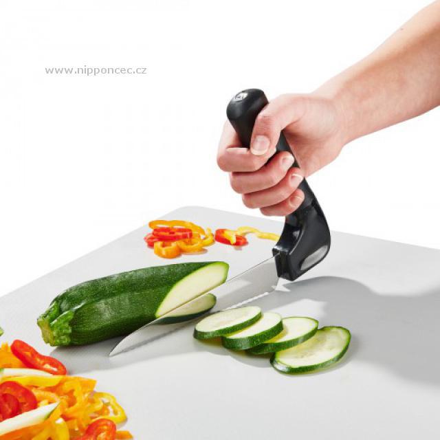 Zahnutá rukojeť pro menší úsilí při krájení, vhodné pro seniory.
