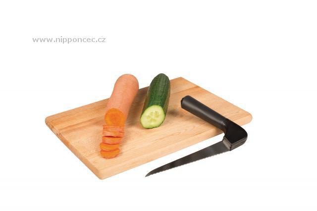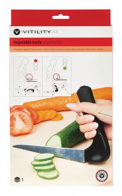 Kuchyňský nůž na zeleninu z řady All Vitility má zahnutou rukojeť. Díky tomu je ke krájení zeleniny potřeba minimálního úsilí. Zahnutá rukojeť drží ruku, zápěstí a paži v přirozené (anatomické) poloze, která zabraňuje nadměrnému namáhání zápěstí a s tím související bolestí nebo zánětem. Čepel nože je vyrobena z nerezové oceli a rukojeť je vybavena protiskluzovou vrstvou.