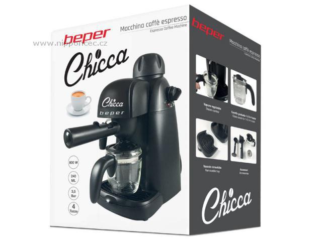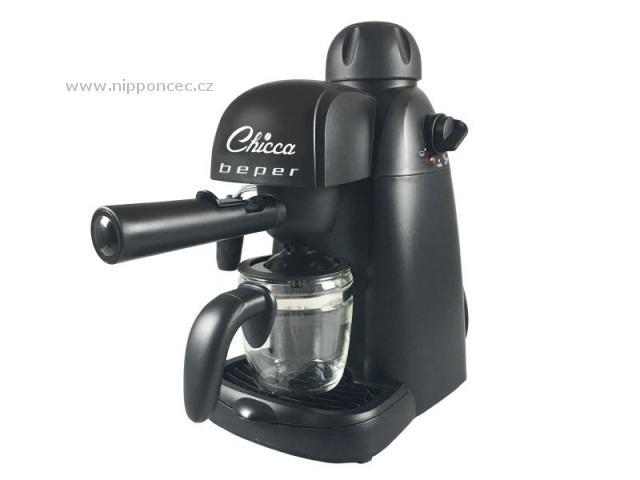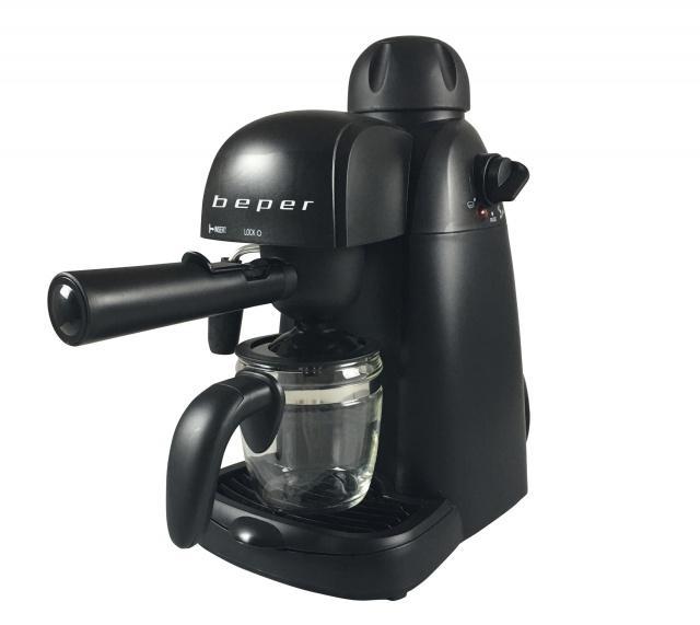 Espresso kávovar BEPER s tryskou na horkou páru a odnímatelnou i omyvatelnou odkapávací miskou. Filtr na 2 nebo 4 šálky kávy. Disponuje osvětlením a skleněnou konvicí o objemu 240 ml. Lze vybrat mezi funkcí kávy nebo páry. Ochranné zařízení proti přehřátí.