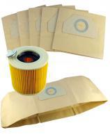 Sada 5ks náhradních papírových sáčků a 1ks filtrační patrony pro vysavače Kärcher. Sáčky i filtr (náhrady) jsou určeny pro vysavače KARCHER A 2003, A 2004, A 2014 CV, A 2024 pt, A 2024, A 2054 Me, A 2054, A 2054, A 2064, A 2074, A 2120, A 2120 Me, K 2054 Kärcher.
